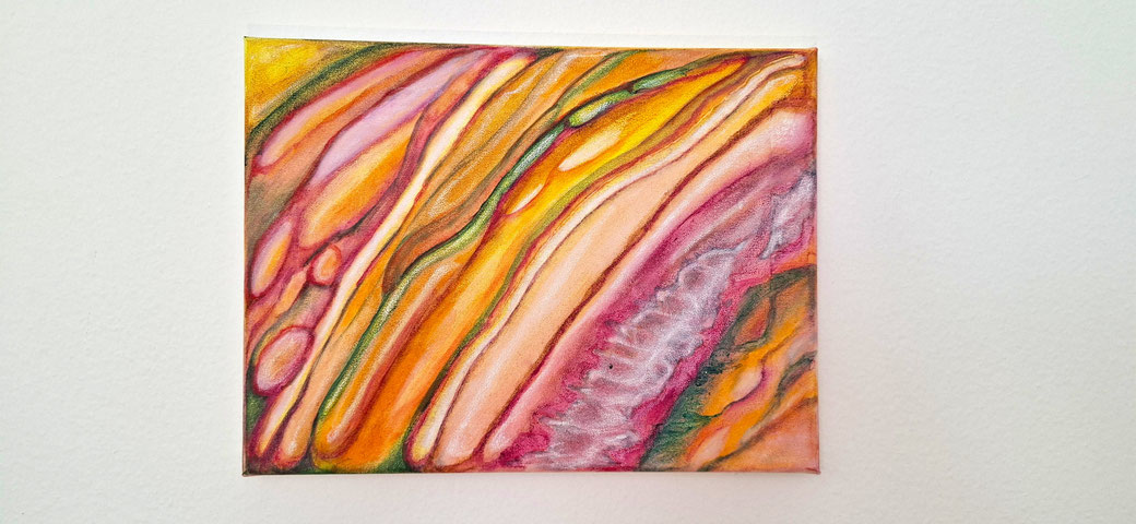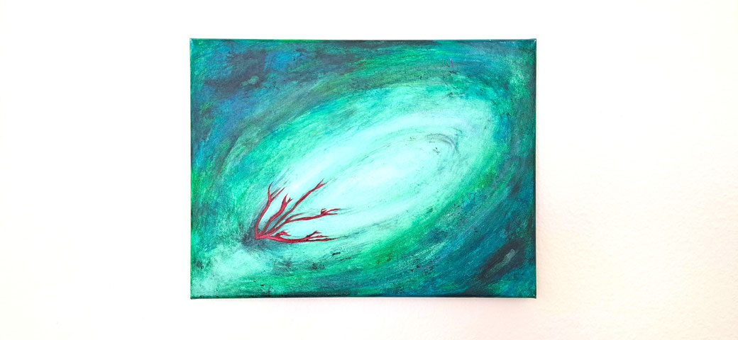 Dieses Bild war das erste, das ich gemalt habe mit Acryl nach einer Operation an meiner Gebärmutter. Danach folgte ein langer Heilungsweg – nicht nur physisch, sondern auch emotional und seelisch. Ich bin tief eingetaucht in die Heilung der Beziehung zu meinen Gefühlen und Empfindungen, ja zu meinem ganzen Wesen, und in die Heilung der tief verwundeten Weiblichkeit.